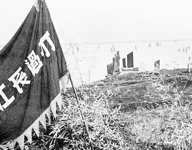 4月20日,44师召开渡江作战誓师大会,15军党委把分别写着“打过长江去”和“解放全中国”两面大旗授予44师第一梯队的130团和131团1营,全师指战员激情满胸,斗志昂扬。21日19时30分,突击团到达华阳镇进攻出发地点。趁天黑下雨之机,在炮火掩护下,副师长方文举亲率第一梯队4个营乘船于23时向长江南岸进发。各条战船的指战员们英勇顽强,动作迅猛,不顾敌人猛烈的火力袭击,利用铁锹、钢盔等作划水工具,冒着枪林弹雨奋勇前进。由于我军掩护炮火的密度太小,弹药又少,很难长时间压制敌人的炮火,对沿岸敌步兵的压制更是力所不及。战后观察,130团突击地段,正在香山沿江横出的山梁下,敌居高临下,对我抵近船只进行俯射,我许多船只向下溜,沿岸挨打,伤亡较大。该团伤亡350人中,有1/3是在航渡和登陆前被击中。但所有船只,不管多大伤亡都坚决顽强靠岸登陆。