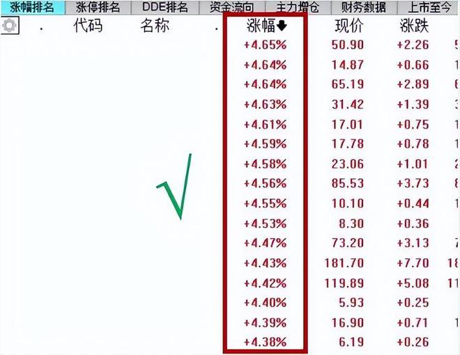 第二步,通过涨幅3%-5%筛选。选涨幅3%-5%是因为股票经过多空双方一天的博弈之后,低于3%说明这支股票比较弱,超过了5%的位置过高,风险较大。